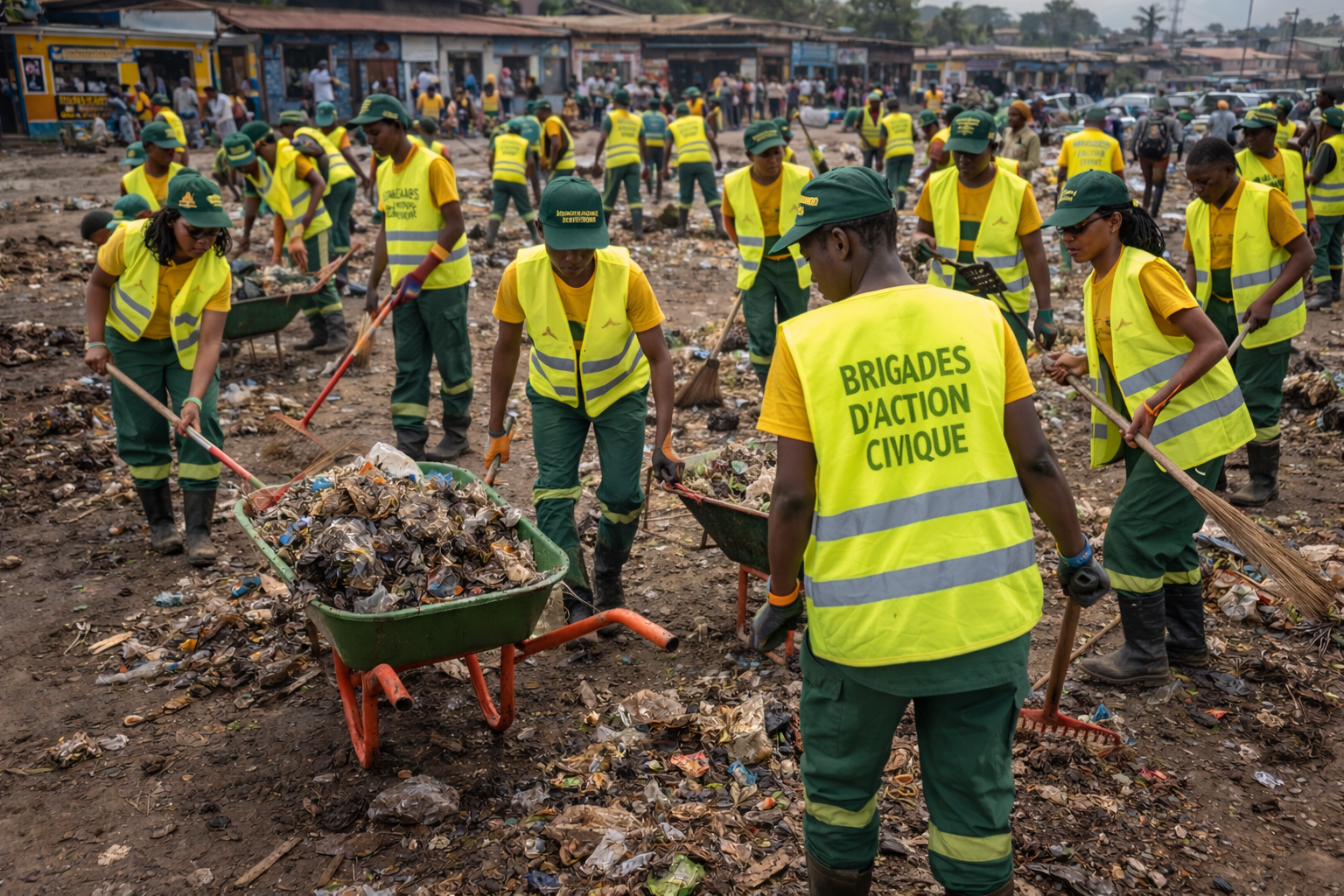 - Troisième solution : Action de nettoyage, des actions régulières ont été entreprises pour assainir les espaces publics. Ces interventions visaient non seulement la salubrité environnementale, mais aussi l’implication active des communautés locales compseée en majorité par les jeunes pour une appropriation durable des solutions d’hygiène. Afin de pérenniser ces actions de salubrité, la « Brigade d’Actions Civiques », a été créée, formée et équipée par le projet spécifiquement pour ces missions. Elle est composée de 30 jeunes bénévoles engagés, répartis à raison de 10 jeunes par commune (Ibanda, Kadutu, Bagira), avec une représentation de 15 Filles et 15 Garçons.